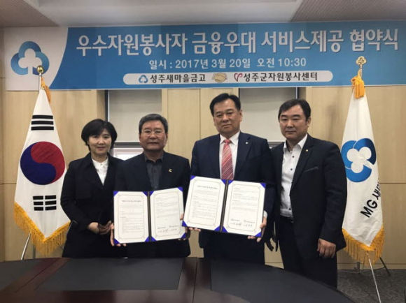 성주군종합자원봉사센터(소장 김차관)와 성주새마을금고(이사장 주남식)는 20일 지역사회를 위해 봉사활동을 펼치고 있는 성주군 자원봉사자를 대상으로 우대금리서비스 적용을 위한 업무협약을 체결했다.