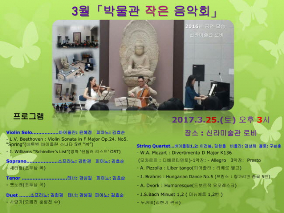 국립경주박물관(관장 유병하)은 3월 25일 오후 3시부터 신라미술관 로비에서 ‘박물관 작은 음악회’를 개최한다.