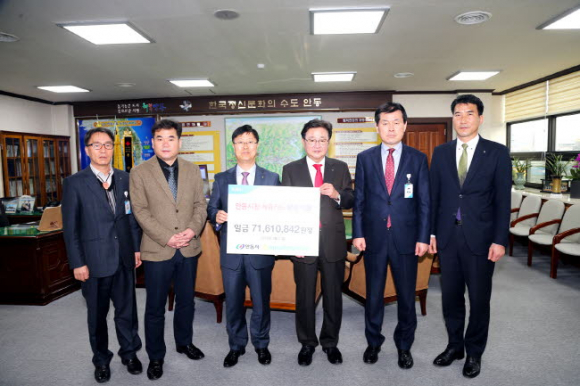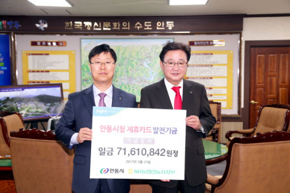 안동시(시장 권영세)는 3월 27일 농협중앙회 안동시지부(지부장 남재원), ㈜비씨카드와 공동운영한 ‘안동문화사랑카드’ 2016년도분 적립액 7,161만원을 전달받는 기금 전달식을 가졌다.