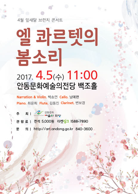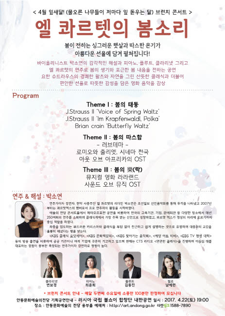 물오른 나무들이 저마다 잎 돋우는 달인 잎새달에 벚꽃 피는 4월 브런치 콘서트가 5일 식목일 오전 11시 안동문화예술의전당 백조홀에서 진행된다. 바이올린니스트 박소연의 감각적인 해설로 열리는 이번 브런치는 ‘엘 콰르텟의 봄소리’라는 타이틀로 피아노, 플루트, 클라리넷 그리고 엘 콰르텟의 앙상블로 봄의 생기와 포근한 봄내음을 만끽하게 한다. 봄의 태동, 봄의 따스함, 봄의 락(樂)이라는 소주제를 가지고 봄이 전하는 싱그러운 햇살과 따스한 온기가 아름다운 선율에 담겨 표현되며 특히 요한 슈트라우스의 경쾌한 왈츠와 편안한 선율로 따뜻한 감성을 담은 영화음악이 봄날에 브런치 콘서트를 통해 관람객에게 다가갈 것으로 기대된다. 잎새달 봄날에 벚꽃 피는 안동문화예술의전당 브런치 콘서트는 일석이조로 공연과 봄을 즐길 수 있는 좋은 기회다. |  | | | ⓒ GBN 경북방송 | |
