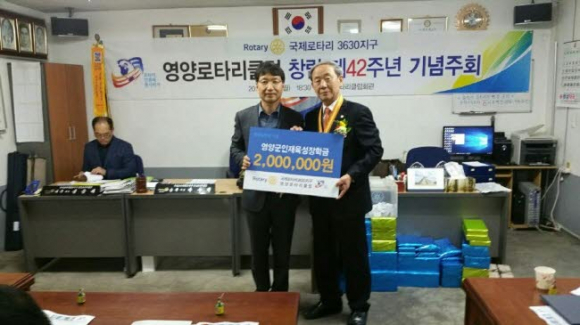 매년 어려운 이웃과 소외된 계층을 위한 성금과 위문품 전달을 통해 지역사회발전에 솔선수범하고 있는 영양로타리 클럽은 창립 제42주년 기념행사를 맞아 인재육성장학기금 200만원을 전달하면서 “이 기금이 우리 지역 학생들이 쾌적한 환경에서 공부할 수 있는 환경을 조성하고 앞으로 영양의 미래를 짊어질 학생들이 꿈을 이루는데 사용될 수 있었으면 좋겠다”고 전했다.