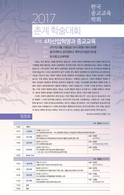 동국대학교 경주캠퍼스는 오는 21일 오후 1시부터 교내 백주년 기념관 대강당에서 ‘4차산업혁명과 종교교육’이라는 주제로 한국종교교육학회 2017 춘계 학술세미나를 개최한다.