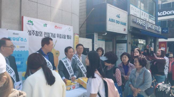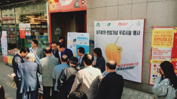 성주군(군수 김항곤)은 참외 소비 확대를 위하여 참외주스 런칭행사를 4월26일 쥬씨 명동역점에서 추진하였으며 새로운 참외 음료를 선보이기 위한 무료시음회를 개최했다.