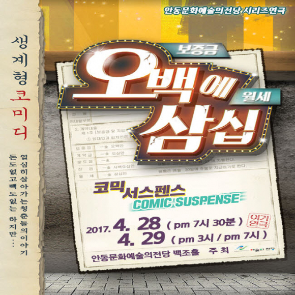 안동문화예술의전당(관장 권혁서)은 봄의 향기 가득한 4월의 마지막 주 안동문화예술의전당 연극시리즈 ‘오백에 삼십’ 공연을 28일(금)엔 오후 7시30분, 29일(토)은 오후 3시와 7시 양일간 3차례에 걸쳐 안동문화예술의전당 백조홀에서 진행된다. 연극 ‘오백에 삼십’은 누구나 공감하는 우리 주변의 이야기로 보증금 500만원에 월세 30만원을 내며 다닥다닥 붙어서 살지만 옆집에 누가 사는지도 모르고 서로에게 무관심한 세상 속에서 돈도 없고 ‘빽’도 없는... 하지만 열심히 살아가는 청춘들의 단순한 코믹 극이 아닌 코믹서스펜스 청춘 연극이야기다. 정말 웃긴 대사들 속에서도 한편으로는 마음이 먹먹하고 크게 웃을 수 없는 우리네 현실을 너무나도 잘 표현하고 있다. 남녀노소 구분 없이 크게 공감하고 즐길 수 있는 ‘별일 아니지만, 우리의 삶 속에서 분명히 일어날 수 있는 일’ 우리네 일기 같은 작품으로 관람객에게 다가갈 것으로 기대된다. |  | | | ⓒ GBN 경북방송 | |