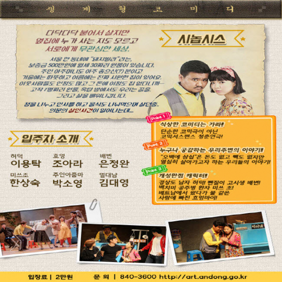안동문화예술의전당 관계자는 “봄을 맞아 안동문화예술의전당 기획공연 연극시리즈를 통해 힘겨운 시대를 지내고 있는 시민들에게 따스한 웃음과 희망을 안겨줄 것이다.”라고 전했다. 관람료: 전석 2만원 / 관람연령: 중학생 이상 자세한 내용은 전화 840-3600번 또는 안동문화예술의전당 홈페이지(http://art.andong.go.kr)로 확인할 수 있다. |