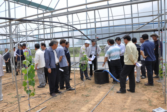 이 같은 문제점을 지중냉풍(20℃)을 이용해 하우스 내 온도를 약 3~5℃정도 하강시켜 숙기를 20일 정도 촉진시켜 출하시킴으로서 포도를 높은 가격에 받을 수 있다고 한다.
