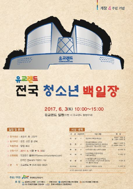 경상북도관광공사(사장 김대유)는 안동문화관광단지內 위치한 3대가 함께 즐길 수 있는 체험테마파크 유교랜드에서 6월 3일‘제1회 유교랜드 전국청소년 백일장’을 개최한다고 밝혔다.