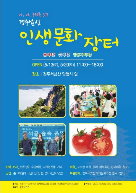 동국대학교 경주캠퍼스는 오는 13일과 20일 11시부터 경주 서남산 망월사 앞에서 ‘경주남산 인생문화 장터 나눔’행사를 개최한다.
