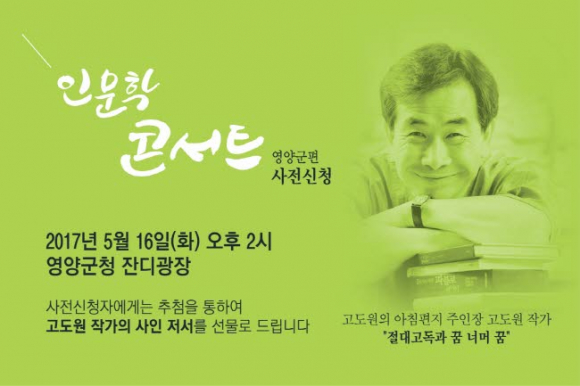 파란 하늘, 기분 좋은 햇살을 맞으며 인문학과 함께 인생의 좌표를 찾아보는 것은 어떨까? 현시대에 주어진 새로운 과제를 인문학적 통찰로 다뤄보기 위해 마련된 인문학콘서트는 5월 16일(화) 영양군청 잔디광장에서 펼쳐진다. 고도원의 아침편지 운영자인 고도원 작가가 <절대고독과 꿈 너머 꿈>이라는 주제로 강연한다.