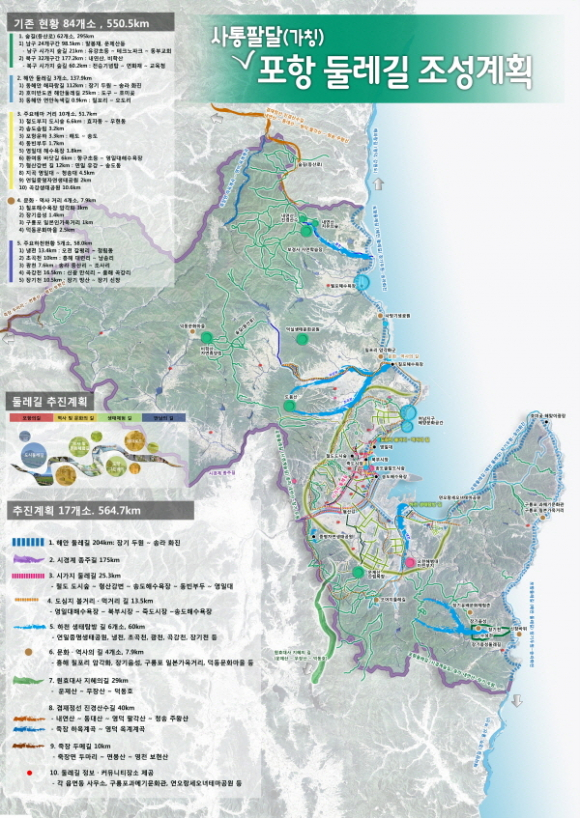 우선 장기 두원에서 송라 내연산까지 시 경계 종주 숲길 175km와 일출과 해넘이를 모두 볼 수 있는 호미곶 해안 둘레길을 아울러 산림에서 해안까지 포항을 크게 한 바퀴 걸을 수 있도록 조성한다.