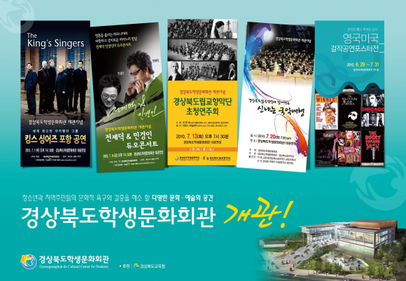 한편, 경상북도학생문화회관 개관기념 공연 및 전시 일정은 다음과 같다. 7월 9일(금) 오후 7시 30분 전제덕 및 민경인의 재즈무대 공연 7월 13일(화) 오후 7시 30분 경북도립교향악단 초청연주회 7월 20일(화) 오후 7시 30분 경북도립국악단 초청연주회 6월 29일(화) ~ 7월 31일(토) 영국 & 미국 걸작공연 포스터전(전시실) |