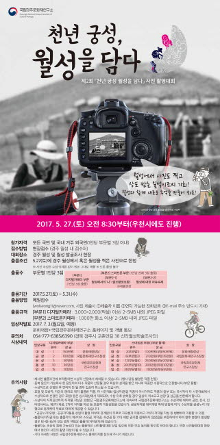 참고로, 지난해 5월에 열린 제1회 「천년 궁성, 월성을 담다」 사진 촬영대회에서는 약 500여 명이 참여하였고, 디지털카메라와 스마트폰 부문 각각에서 35명씩 총 70명이 시상하였으며, 수상작들에 대한 사진전은 경주시 경주예술의전당(2016.11.22.~26.), 국립문화재연구소와 함께 대전광역시 지하철 역사 2곳(지족역, 대전역)에서 전시(2016.12.21.~2017.1.31.)된 바 있다.