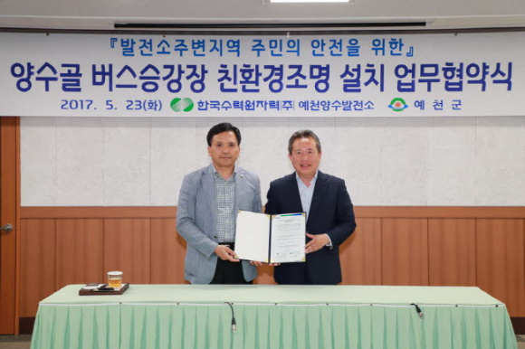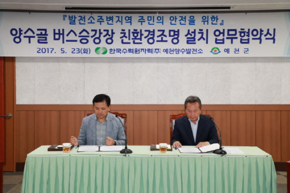예천군(군수 인현준)과 한국수력원자력(주) 예천양수발전소는 23일 오후 2시 예천군청 영상회의실에서 버스승강장 친환경조명 설치에 관한 업무협약을 체결했다.