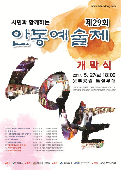 안동시(시장 권영세)가 주최하고 한국예총안동지회(지회장 정숙희)가 주관하는 ‘제29회 안동예술제’가 5월 26일부터 6월 4일까지 10일간 안동 웅부공원 특설무대와 안동문화예술의전당, 세계물포럼기념센터에서 열린다. 지역 예술인들의 뜨거운 예술혼으로 빚어낸 수준 높은 공연과 작품들이 5월 26일(금) 전야제 공연, 5월 27일(토) 개막식을 시작으로 다채롭게 행사장 곳곳에서 열린다. |  | | | ⓒ GBN 경북방송 | |