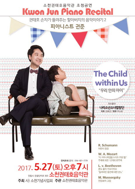 <공연 일정> ‣ 일 시: 2017년 5월 27일(토) 오후 7:00 ‣ 장 소: 소천권태호음악관 (b1.강당) ‣ 문 의: 054-821-7779 ‣ 입장료: 전석 무료관람 (선착순 입장)