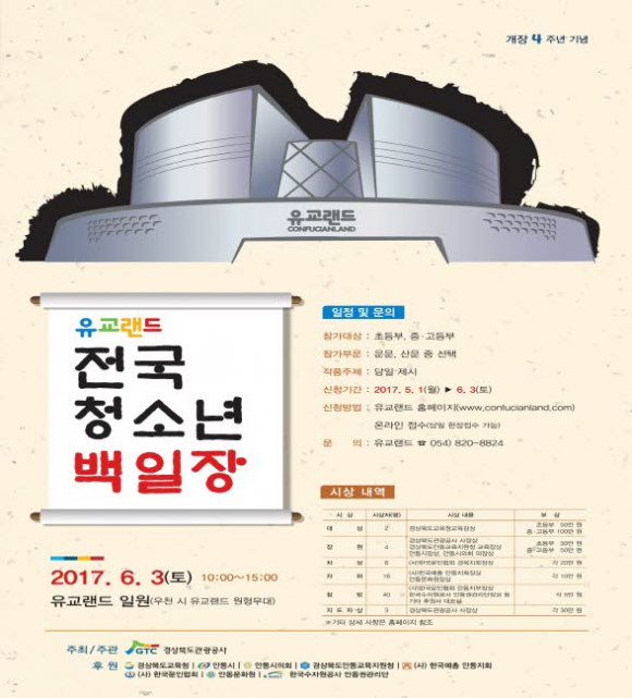경상북도관광공사(사장 김대유)는 6월 3일 10시부터 안동문화관광단지 內 위치한 3대가 함께 즐길 수 있는 체험테마파크 유교랜드에서 ‘제1회 유교랜드 전국청소년 백일장’을 개최한다고 밝혔다.