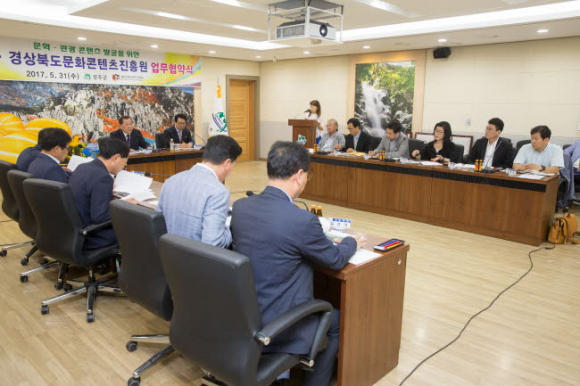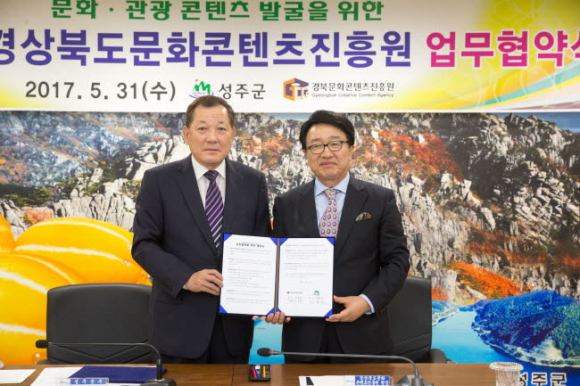 성주군(군수 김항곤)과 경상북도문화콘텐츠진흥원(원장 김준한)은 5월 31일 성주군청 소회의실에서 체계적인 협력시스템 마련과 지역 맞춤형 콘텐츠산업 발전을 위한 정책개발 및 산업활성화를 지원하고, 각종 정보의 상호교류를 통해 시너지 효과를 창출하고자 업무협약(MOU)을 체결했다.