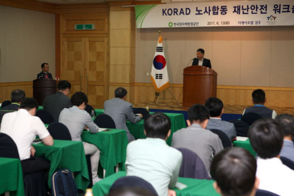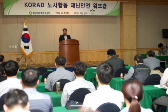 한국원자력환경공단(이사장 이종인)은 13일 경주 더케이호텔에서 노동조합 및 회사측 간부, 부서별 안전문화 담당자, 협력업체 실무 담당자 등 40여명이 참석한 가운데 노사합동 재난안전 워크숍을 실시했다.