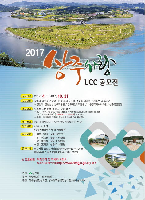 상주시는 10월 31일까지 ‘2017 상주사랑 UCC 공모전’을 개최한다고 밝혔다. 이번 공모전은 낙동강의 수려한 자연경관을 바탕으로 무한한 발전 잠재력을 가진 관광상주의 아름다운 영상콘텐츠를 발굴하여 상주를 전국에 홍보하고자 실시되었다.