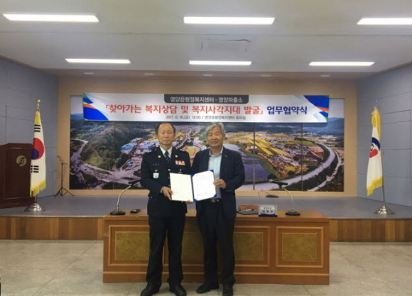 영양읍행정복지센터(읍장 이영우)와 영양파출소(소장 남상철)는 지난 16일 ‘찾아가는 복지상담의 안전성 강화 및 복지사각지대 발굴을 위한 업무협약(MOU)’을 체결했다.