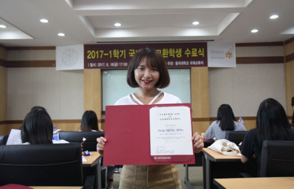 차이멍팅 학생은 “동국대 경주캠퍼스 교수님들과 친구들의 세심한 배려와 도움으로 큰 어려움없이 성공적으로 교환학생과정을 수료할 수 있었다” 며 “특히 대만과 한국에서 복수학위를 취득한 것을 바탕으로 양국의 교육 환경과 문화를 접한 것이 앞으로 활동에 좋은 밑거름이 될것이라 생각한다”고 말했다.