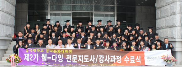 동국대는 국내 대학 최초로 불교문화대학원 웰다잉전문지도사(강사) 과정을 개설하여 2009년 12월 1기 60명의 웰다잉지도사(2급)와 이번에 2기 54명을 배출하였으며 오는 9월에 제3기 과정을 개강할 예정이다. 제3기 수강생 모집은 오는 8월부터 접수하며 문의는 동국대 불교문화대학원(전화 054-770-2393)으로 하면 된다. |