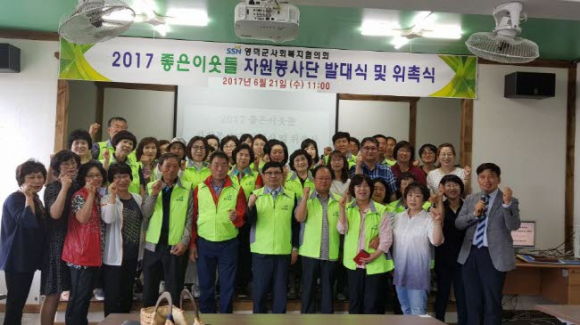 영덕군사회복지협의회(회장 이희원)는 6월 21일(수) 11시, 영덕지역자활센터 교육장에서 복지소외계층 발굴ㆍ지원 확대를 위한 『2017년 좋은이웃들 자원봉사단 발대식 및 위촉식』을 봉사활동을 신청한 60여명이 참석한 가운데 영덕군사회복지협의회 자체 행사로 조촐하게 개최했다.