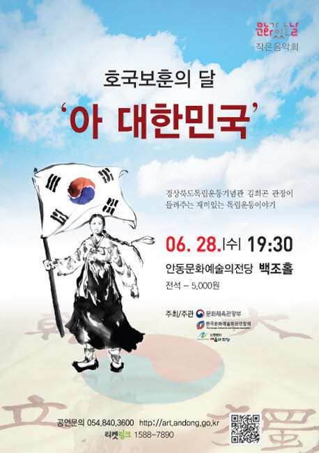 안동문화예술의전당(관장 권혁서)은 호국보훈의 달을 맞이해 6월 마지막 주 수요일 문화가 있는 날 공연 “아! 대한민국” 보훈음악회를 28일(수) 저녁 7시 30분 백조홀에서 진행한다. 이번 공연은 문화체육관광부 주최하고 한국문화예술회관연합회와 안동문화예술의전당이 주관하는 공연으로 호국보훈의 달을 맞이해 전국에서 가장 많은 독립운동가를 배출한 지역에서 개최하는 특별한 음악회이다.