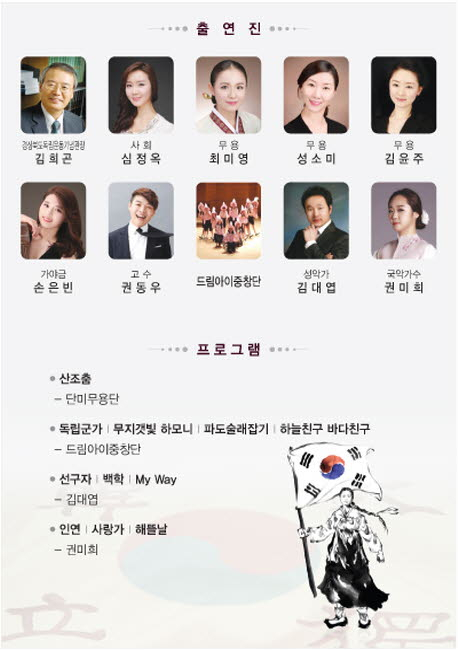 이날 공연은 나라를 위해 고귀한 목숨을 바친 순국선열의 희생을 기리며, 특별히 나라사랑을 주제로 경상북도독립운동기념과 김희곤 관장이 들려주는 재미있는 독립운동이야기와 국악, 무용, 클래식 등 다양한 연주자들의 공연으로 호국정신을 되새기는 공연으로 진행된다.