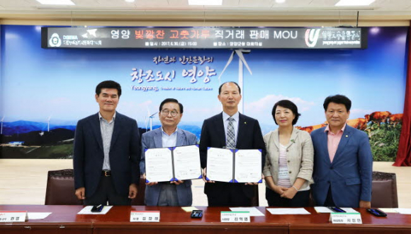 영양고추유통공사(사장 김장래)는 6월 30일 대한주택관리사협회 대구시회와 영양군청 대회의실에서 빛깔찬 고춧가루 직거래판매를 위한 MOU체결을 했다. 이날 영양군에서는 영양군수, 영양군의회 의장, 영양고추유통공사 관계자와 대한주택관리사협회 대구시회 임·직원 100명이 참석을 했다.