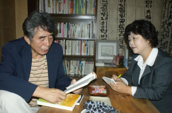 황명강 : 선생님 안녕하십니까. 며칠을 긴장하고 설렜는데 선생님의 편안한 모습을 뵈니 걱정이 옅어집니다. 대담에 응해 주셔서 감사합니다. 대담에 앞서 제가 들고 온 이 책(2007 미당문학상 수상 작품집)에서 시 한 편 골라 읽어주시겠습니까. 어느 행사에서의 시 낭송 하시는 모습 오래 기억에 남아있습니다.