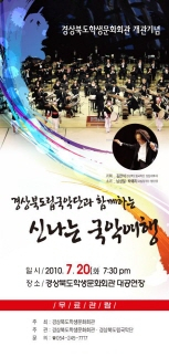 경북도립국악단 초청연주회는 김만석 지휘자 아래 성주굿과 판굿, 관현악 신뱃놀이, 거문고 협주곡 출강, 무용과 관현악 ‘여명의 빛’, 흥보가 중 ‘흥보 박타는 대목’등을 연주한다.