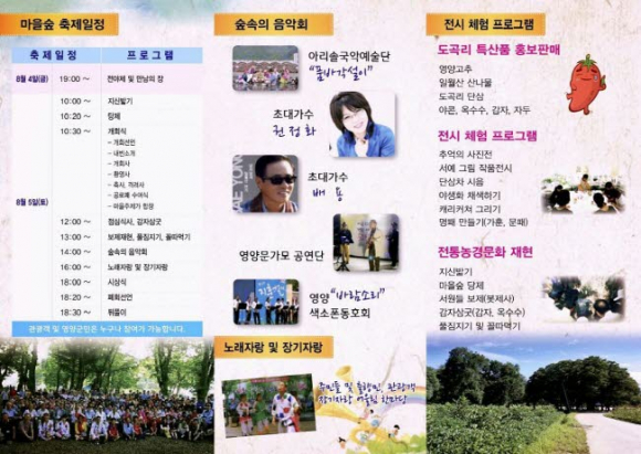 무대 옆 몽골텐트에서는 추억의 사진전, 주민과 출향민이 직접 쓰고 그린 서예와 그림 작품이 전시된다. 캐리커처 그리기, 야생화 채색하기, 명패 만들기 등 다양한 체험 프로그램도 인기를 끈다. 도곡리 특산품인 일월산 산나물과 고추, 단삼, 야콘 등 판매부스도 마련될 예정이다.
