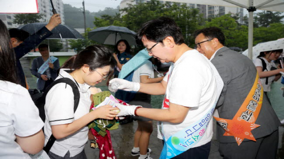 지난달 3일 민선6기 3주년을 맞은 권 시장은 예년과 달리 별다른 기념행사 없이 길원여자고등학교에서 안동경찰서, 안동교육지원청, 학교 선생님들과 함께 등교하는 학생들에게 아침 식사로 아침밥을 나눠주며 학교폭력 예방 홍보활동에 나섰고 학교현장 어려움을 청취하기도 했다.