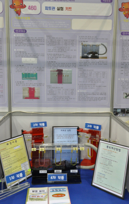 국무총리상의 영예를 차지한 경산과학고등학교 2학년 이준엽(지도교사 이승연)의 ‘피토관 실험 키트’는 팬으로 공기를 흐르게 하면 피토관에서 압력 차이에 의한 수면 변화로 유체의 밀도, 압력, 풍속에 대한 정량적 실험과 데이터 비교가 가능한 풍속계로 사용할 수 있는 학습용품이다.