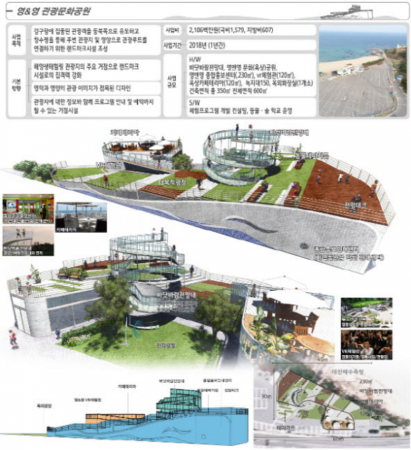 특히 영덕군 주요사업은 영&영 관광문화공원 조성사업으로 광역교통망개통 개발호재의 시기에 지역 관광자원의 균형적 활성화와 내륙․해양자원을 연계하는 북부지역 핵심거점 랜드마크 시설을 구축하는 사업으로 이번 공모사업으로 북부 4개면 개발의 신호탄으로 첫 단추를 꿰게 되었고 향후, 고래불 국민야영장과 연계하는 지역의 신관광 성장동력으로 육성할 계획이다.