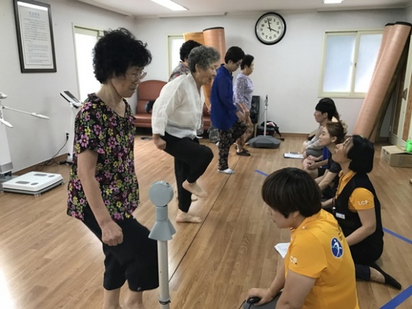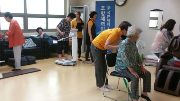 |  | | | ⓒ GBN 경북방송 | | 한편 사전 건강검사는 국민체력인증센터와 연계하여 건강행태설문조사, 혈압, 혈당, 체성분 및 체력검사로 진행됐으며, 체력검사는 노인기 대상에 맞추어진 근기능, 평형성, 유연성, 심폐지구력, 협응력 항목으로 상대악력, 의자에 앉았다 일어서기(회/30초), 앉아서 윗몸 앞으로 굽히기, 2분 제자리 걷기 등을 측정·평가하여 어르신들의 건강한 자립생활을 돕는다는 목적이다.