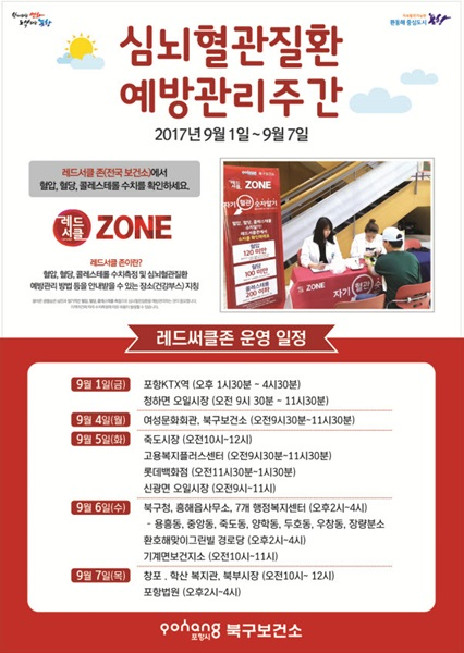 |  | | | ⓒ GBN 경북방송 | | 9월 첫째 주는 질병관리본부에서 지정한 심뇌혈관질환예방관리주간으로, 국민들에게 심근경색, 뇌졸중과 같은 중증 심뇌혈관질환예방관리 방법을 알리고, 자기혈관 숫자알기라는 슬로건으로 혈압 혈당 콜레스테롤 조기검진을 시행하는 레드써클존을 전국단위로 운영한다.