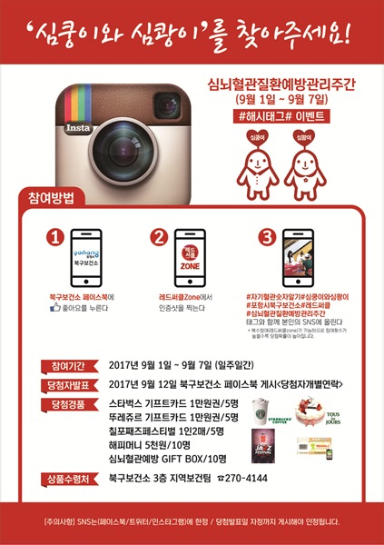 북구보건소는 9월 1일부터 7일까지 죽도시장, 고용복지플러스센터, 포항KTX역, 여성문화회관, 각 주민센터 및 20개소가 넘는 장소에서 레드써클존을 운영하며, 레드써클존에서 인증샷을 찍고 본인 SNS에 자기혈관숫자알기, 심쿵이와심쾅이, 심뇌혈관예방관리주간 등을 해시태그해서 올리는 이벤트를 진행한다. 추첨을 통해 스타벅스, 뚜레쥬르 기프트카드, 해피머니, 오는 9월 22일에서 24일 진행되는 칠포재즈페스티벌 티켓 등 다양한 선물을 지급한다.