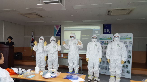 이번 훈련은 개인보호복(Level D) 착탈의법 동영상 시청 후 보호복, 덧신, N95마스크, 이중장갑, 고글 등 전 직원이 직접 체험함으로서 메르스 등 감염병위기 상황 시 감염병 확산 방지 및 신속한 대처 능력을 향상하고 감염병으로부터 의료인을 보호하기 위하여 실시했다.