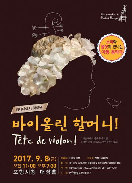 9월 8일 오전 11시와 오후 7시 30분 포항시청 대잠홀에서 선보이는 캐나다에서 찾아온 「바이올린 할머니」의 공연시간은 45분이며, 관람료는 전석 1만5천원이다.