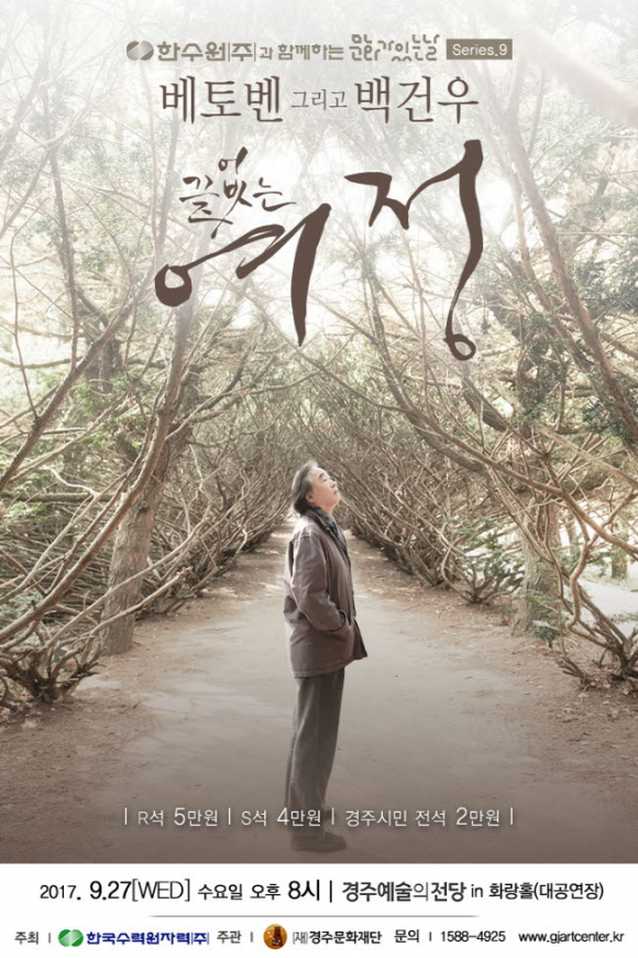 세계적인 피아니스트 ‘백건우’의 무대를 경주에서 만난다. 이번 공연은 베토벤을 향한 백건우의 사랑을 볼 수 있는 프로그램으로 구성되어있다. 한수원과 함께하는 문화가 있는 날 시리즈로 오는 27일 오후 8시 경주예술의전당 화랑홀에서 열릴 예정이다.