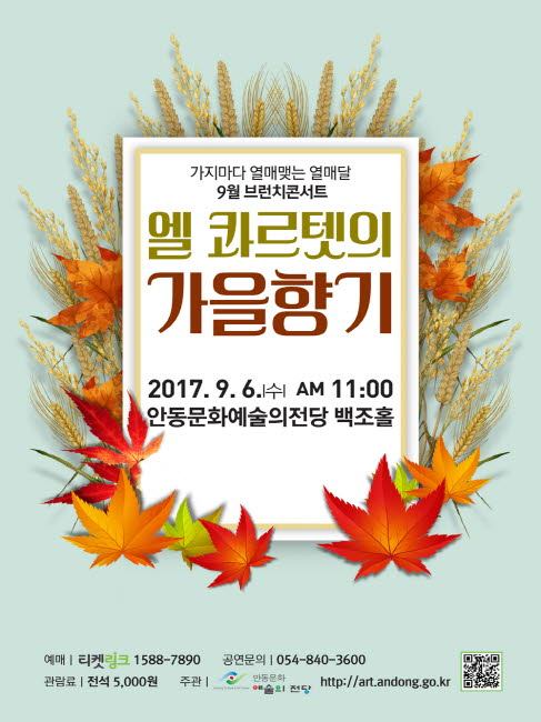 안동문화예술의전당의 브런치 콘서트의 ‘엘 콰르텟의 클래식 시리즈’가 9월 가지마다 열매 맺는 달인 열매의 달에 <가을향기>로 오는 6일 오전 11시 안동문화예술의전당 백조홀에서 진행된다.