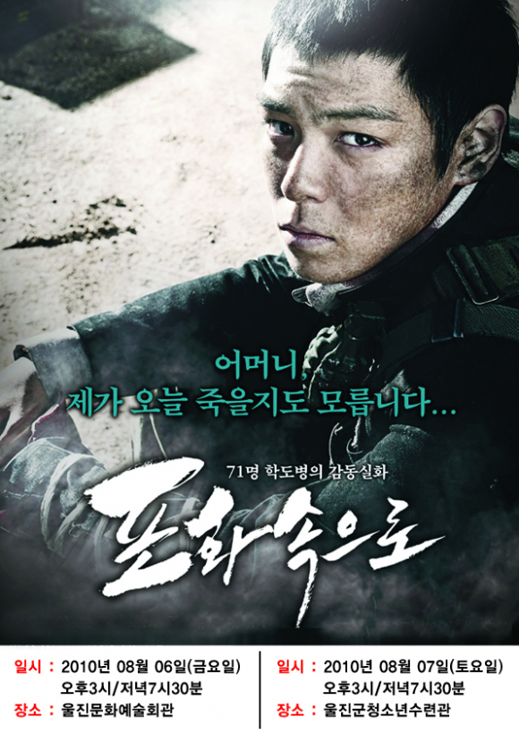 권상우, 차승원, 김승우, 최승현(탑)이 주연인‘포화속으로’는 1950년 8월, 한국전쟁의 운명이 걸린 낙동간 지지선을 지키기 위한 남과 북의 처절한 전쟁 한복판에서 교복을 입고 포화속으로 뛰어 든 학도병 71명의 슬프고도 위대한 전투를 그린 실화 영화이다.