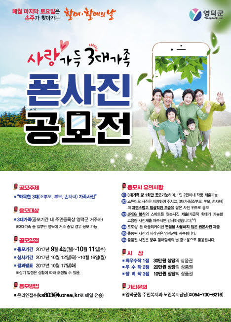 영덕군은 매월 마지막 토요일은 손주가 찾아가는 “할매·할배의 날”을 홍보하고 3대가 함께하는 가족공동체를 장려하기 위해 오는 10월 11일(수)까지 「사랑가득 3대 가족 폰사진 공모전」을 개최한다.