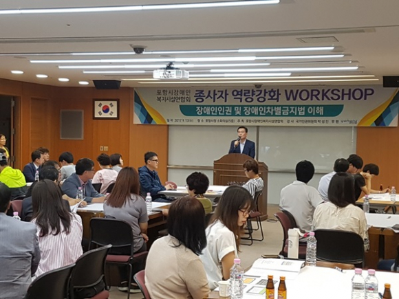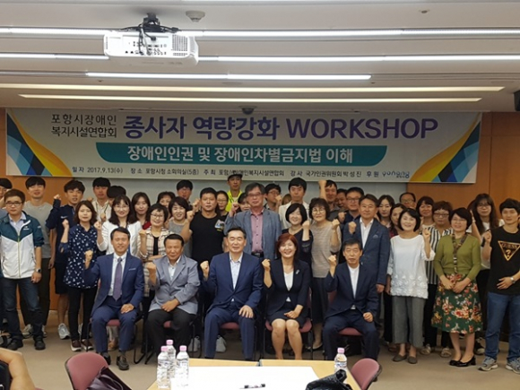 |  | | | ⓒ GBN 경북방송 | | 포항시장애인복지시설연합회(회장 황순희)가 지난 13일 포항시청 5층 소회의실에서 ‘장애인인권과 장애인차별금지법 이해’의 주제로 종사자 역량강화 워크숍을 열었다.