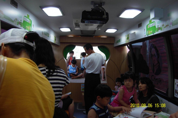 네이버의 지원으로 운영되는 ‘책 읽는 버스’는 45인승 버스를 개조해 총 2,000여 권의 책을 구비한 움직이는 도서관으로 버스 안에서 자유롭게 책을 보고 여러 가지 체험을 할 수 있다.