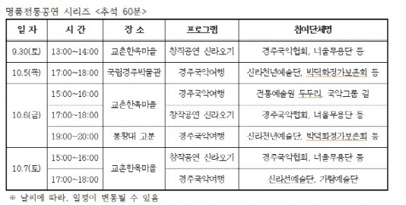 먼저 경주의 숨겨진 전통공연을 찾아보는 ‘명품전통공연 시리즈 <추석 60분>’은 경주의 랜드마크인 경주교촌한옥마을, 봉황대, 국립경주박물관 등에서 9월 30일부터 10월 7일까지 진행된다. 신라향가, 대금산조, 퓨전국악 등 명품국악공연과 창작공연 신라오기 공연을 볼 수 있다. 세부일정은 아래를 참고하면 된다.