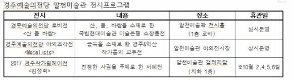 또한 경주문화재단은 추석연휴 동안 경주예술의전당을 찾는 관람객을 위해 경주예술의전당 알천미술관 전시프로그램을 정상 운영한다. 야외전시장, 전시홀, 갤러리달에서 진행되는 전시를 보실 수 있으며, 세부일정은 아래를 참고하면 된다.