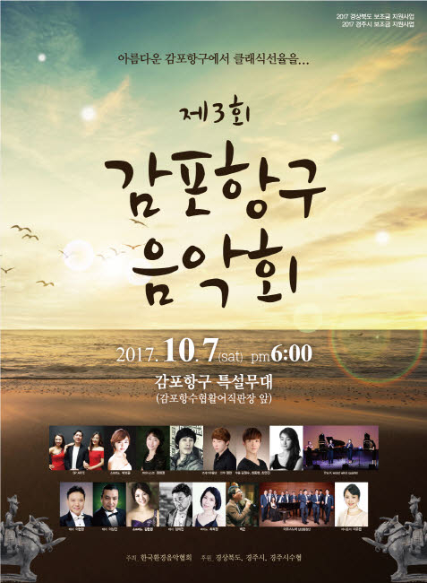 한국환경음악협회가 (회장 이상진) 주최하고 경상북도, 경주시, 경주시수협이 후원하는 감포항구 음악회는 경주와 인근 지역에서 왕성한 활동을 펼치고 있는 프로음악가들이 총출동하는 클래식 음악회로, 피아니스트 최희정, 정희정 교수, 이은경 반주자 등 경북지역대학 교수진들과 소프라노 박보윤, 김한경. 테너 이현영, 임재진 등 스타 성악가들이 한자리에 선다.
